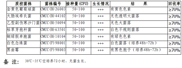 接种以下质控菌株,放置30-35℃需氧培养18-24小时。 注:回收率计算时,用TSA琼脂做对照培养基。