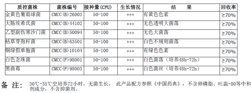 接种以下质控菌株,放置30-35℃需氧培养18-24小时。 注:回收率计算时,用TSA琼脂做对照培养基。
