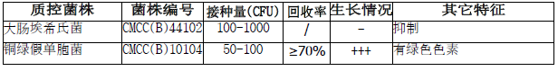 按标签用法制备培养基,接种以下质控菌株,放置30-37℃需氧培养18-24小时。注:回收率计算时,用TSA琼脂做对照培养基。