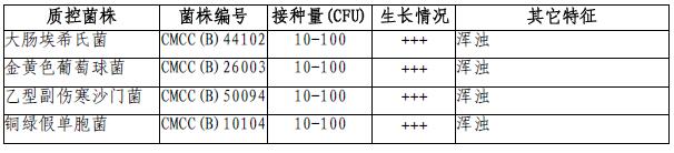 按标签用法制备培养基,接种以下质控菌株,放置30-35℃需氧培养18-24小时。注:回收率计算时,用TSA琼脂做对照培养基。