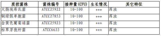 按标签用法制备培养基,接种以下质控菌株,放置36±1℃需氧培养18-24小时。
