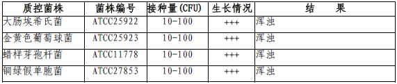 微生物生长:培养基接种大肠埃希氏菌(ATCC 25922)、金黄色葡萄球菌(ATCC 25923)、蜡样芽孢杆菌(ATCC 11778)和铜绿假单胞菌(ATCC 27853),36℃±1℃需氧培养18 h-24 h,生长良好;30℃-35℃空培养72 h,无菌生长。