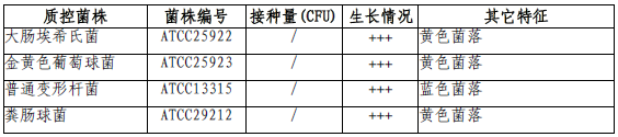 按标签用法制备培养基,接种以下质控菌株,放置36±1℃需氧培养18-24小时。