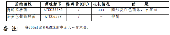 按标签用法制备培养基,接种以下质控菌株,放置36±1℃厌氧培养48小时。