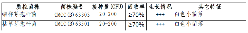 按标签用法制备培养基,接种以下质控菌株,放置36±1℃需氧培养48-72小时。 注:回收率计算时,用TSA琼脂做对照培养基。