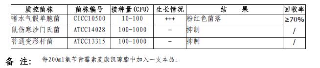 按标签用法制备培养基,接种以下质控菌株,放置37℃需氧培养24小时。