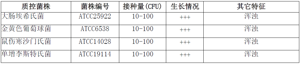 普通肉汤微生物灵敏度试验:按标签用法制备培养基,接种以下质控菌株,放置36℃需氧培养18-24小时。
