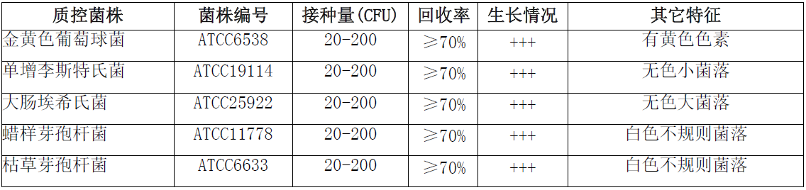 普通琼脂平板微生物灵敏度试验: 按标签用法制备培养基,接种以下质控菌株,放置36±1℃需氧培养18-24小时。注:回收率计算时,用TSA琼脂做对照培养基。
