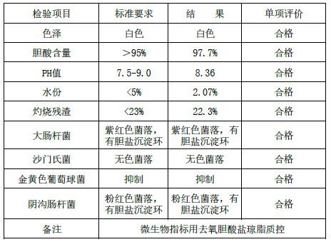 本品是用牛胆汁,采用新工艺提取而成,色泽呈白色,适合做革兰氏阳性菌的抑菌剂。