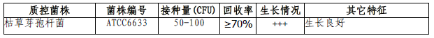 按标签用法制备培养基,接种以下质控菌株,放置36±1℃需氧培养18-24小时。 注:回收率计算时,用TSA琼脂做对照培养基。