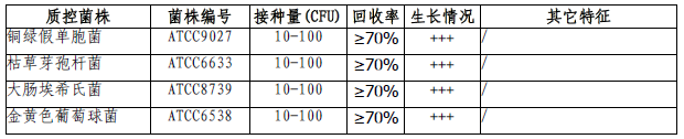 按标签用法制备培养基,接种以下质控菌株,放置30-35℃需氧培养120小时。注:回收率计算时,用R2A琼脂做对照培养基。