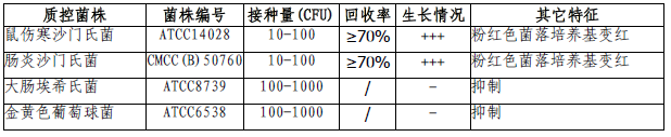 按标签用法制备培养基,接种以下质控菌株,放置30-35℃需氧培养24-48小时。注:回收率计算时,用TSA琼脂做对照培养基。