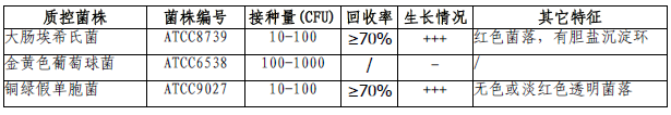按标签用法制备培养基,接种以下质控菌株,放置30-35℃需氧培养18-24小时。 注:回收率计算时,用TSA琼脂做对照培养基。