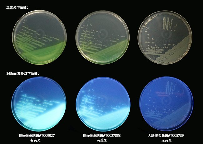不同细菌在荧光色素测定用培养基(USP)上的生长特征