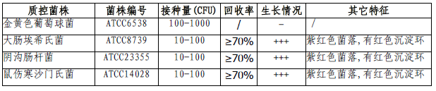 按标签用法制备培养基,接种以下质控菌株,放置30-35℃需氧培养18-24小时。注:回收率计算时,用TSA琼脂做对照培养基。