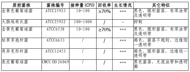 按标签用法制备培养基,接种以下质控菌株,放置30-35℃需氧培养45-48小时。