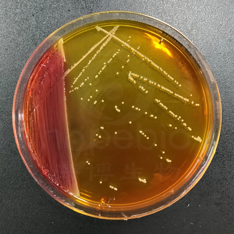 检验原理: 酵母膏粉、蛋白胨、L-赖氨酸提供氮源、维生素、生长因子;木塘、乳糖、蔗糖为可发酵糖类,发酵糖产酸的菌落呈黄色;氯化钠维持均衡的渗透压;硫代硫酸钠可以被某些细菌还原硫化氢,与柠檬酸铁铵中的铁盐生成黑色硫化铁;琼脂是培养基的凝固剂;酚红为pH 指示剂。