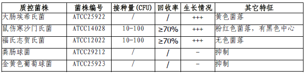 按标签用法制备培养基,接种以下质控菌株,放置36±1℃需氧培养18-24小时。注:回收率计算时,用TSA琼脂做对照培养基。