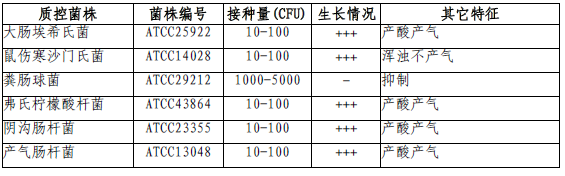按标签用法制备培养基,接种以下质控菌株,放置36±1℃需氧培养24±2小时。