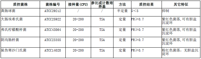 按标签用法制备培养基,接种以下质控菌株,放置36±1℃需氧培养18-24小时。