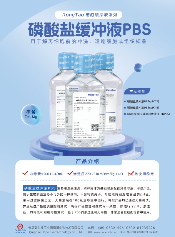 用途:主要用途是漂洗、稀释或作为基础溶液配置其他溶液,用途非常广泛。属于生物实验室必不可少的一种试剂。不含钙镁离子,帮助维持细胞培养基的pH值,采用过滤除菌工艺,无菌灌装在100级洁净室中进行,每批产品均已通过无菌测试,并且经过严格的质量控制测试,确保产品性能和批次间一致性,亦进行了pH、渗透压、内毒素和细胞毒性测试,基于PBS的渗透压和无毒性,非常适合在细胞培养中使用。