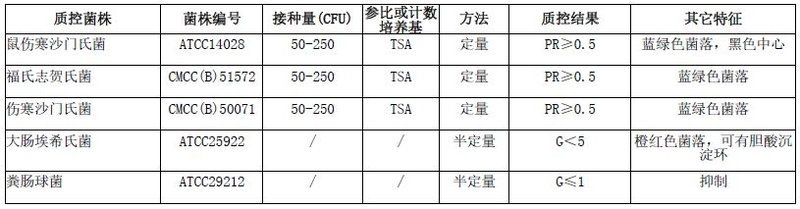 按标签用法制备培养基,接种以下质控菌株,放置36±1℃需氧培养18-24小时。