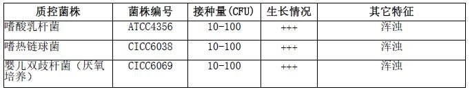 MRS肉汤微生物灵敏度试验:按标签用法制备培养基,接种以下质控菌株,放置36±1℃需氧培养48±2小时。