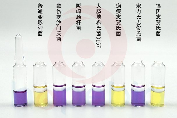 在鸟氨酸脱羧酶肉汤GS012中,普通变形杆菌、痢疾志贺氏菌、福氏志贺氏菌显阴性,培养基呈黄色;
