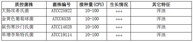 按标签用法制备培养基,接种以下质控菌株,放置36±1℃需氧培养18-24小时。