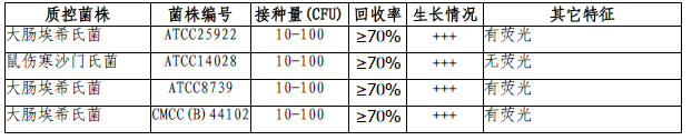 按标签用法制备培养基,接种以下质控菌株,放置36±1℃需氧培养24-48小时。
