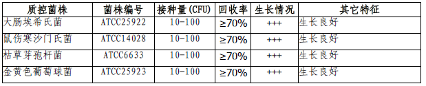 按标签用法制备培养基,接种以下质控菌株,放置36±1℃需氧培养48±2小时。注:回收率计算时,用TSA琼脂做对照培养基。