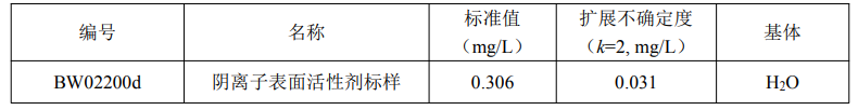 本标准样品用于水中阴离子表面活性剂的分析测试及宣贯的分析方法确认与评价、实验室质量控制。