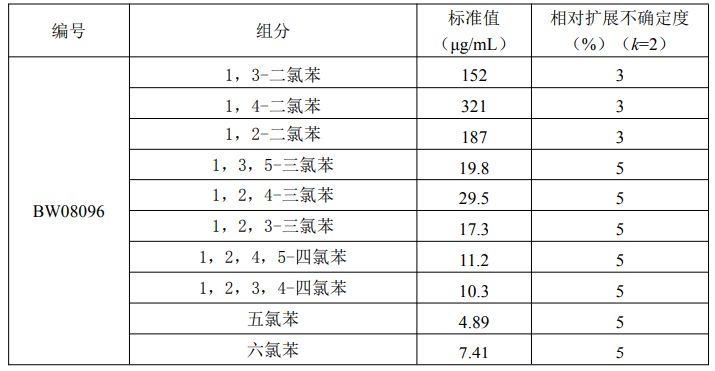 本标准物质以纯度经准确定值的 10 种氯苯纯品为原料,色谱级甲醇为溶剂,采用重量容量法准确配制而成。