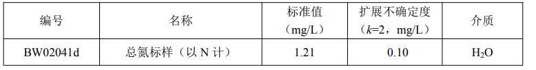 本标准品应按以下程序稀释后方可使用:用清洁干燥的移液管从安瓿瓶中准确移取 10.0mL 标样至 250mL 容量瓶中,用纯水稀释定容至刻度,混匀后立即使用。稀释后的标准值和扩展不确定度为: