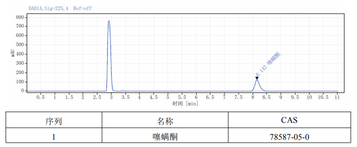 本标准物质采用纯度准确定值的噻螨酮(CAS号:78587-05-0)纯品为原料,以色谱级丙酮为溶剂,采用重量-容量法准确配制而成。
