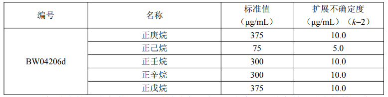 本标准物质以纯度经准确定值的正己烷(CAS号:107-83-5),正庚烷(CAS号:142-82-5),正辛烷(CAS号:111-65-9),正壬烷(CAS号:111-84-2)正戊烷(CAS号:109-66-0)为原料,农残级二硫化碳为溶剂,采用重量容量法准确配制而成。