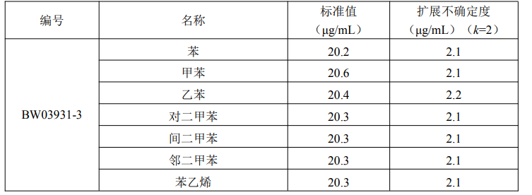 本标准物质以纯度经准确定值的苯系物纯品为原料,以无苯二硫化碳为溶剂,采用重量-容量法准确配制而成。