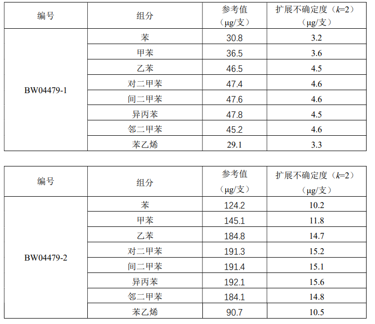2.使用:本质量控制样品测定时适用于溶剂解吸法进行预处理,解吸溶剂为二硫化碳。本质量控制样品确定参考值时,包括了解吸效率的因素,用户在使用过程中,不需考虑解吸效率的影响。