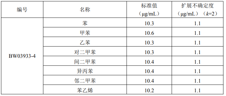 本标准物质以纯度经准确定值的苯系物纯品为原料,以无苯二硫化碳为溶剂,采用重量-容量法准确配制而成。