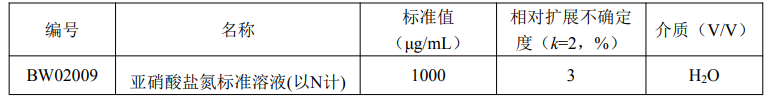 本标准溶液以优级纯亚硝酸钠、全自动逆渗透纯水机制备的实验室一级水为原料,在室温为(20±3)℃的洁净室中采用重量-容量法准确配制而成。