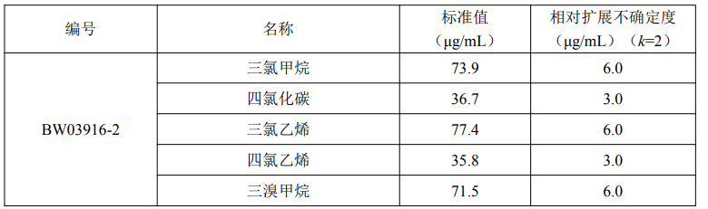 本标准物质采用纯度准确定值的 5 种卤代烃为原料,以色谱级甲醇为溶剂,采用重量容量法准确配制而成。