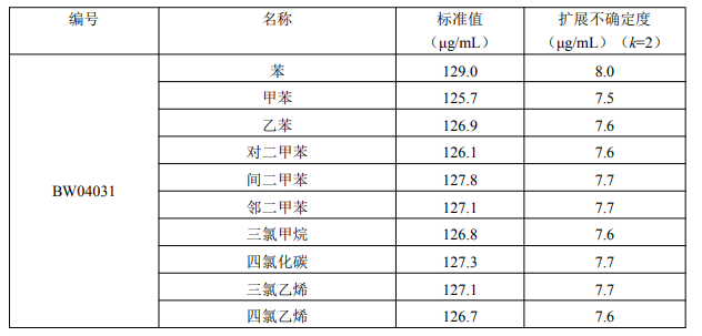 本标准物质以纯度经准确定值的苯、甲苯、乙苯、对二甲苯、间二甲苯、邻二甲苯、三氯甲烷、四氯化碳、三氯乙烯、四氯乙烯纯品为原料,以农残级甲醇为溶剂,采用重量法准确配制而成。