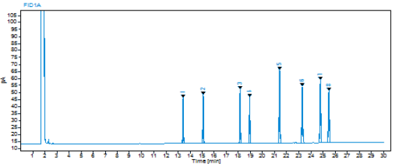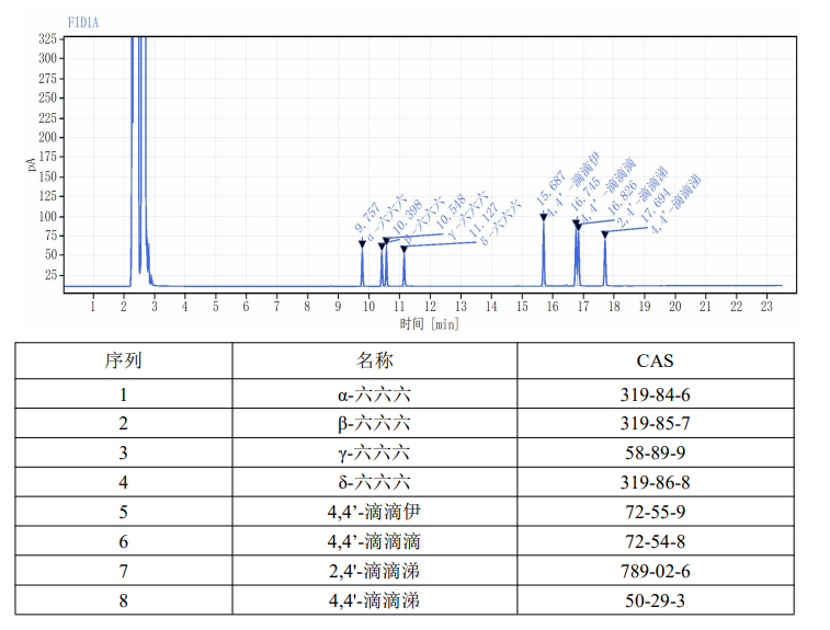 柱箱:60℃→40℃/min→130℃(1min)→12℃/min→180℃(1min)→7℃/min→240℃→5℃/min→260℃(3min)