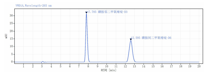 本标准物质采用纯度标准物质磺胺邻二甲氧嘧啶-D3(CAS号:1262770-70-6)、磺胺间二甲氧嘧啶-D6(CAS号:73068-02-7)为原料,以色谱级甲醇为溶剂,采用重量-容量法准确配制而成。