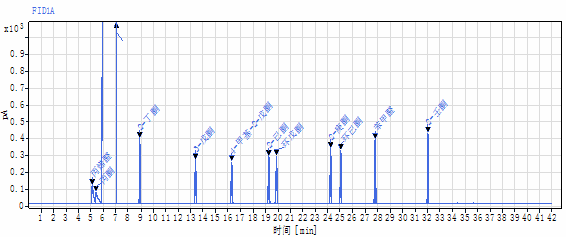 柱箱:38℃(3min)→5℃/min→70℃(5min)→5℃/min→140℃(1min)→8℃/min→200℃(5min)