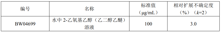水中2-乙氧基乙醇(乙二醇乙醚)溶液标准物质介绍: