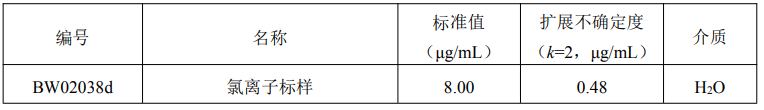 本标准样品以国家有证纯度标准物质氯化钠GBW(E)060314、全自动逆渗透纯水机制备的实验室一级水为原料,在室温为(20±3)℃的洁净室中采用重量-容量法准确配制而成,采用离子色谱法进行量值核对,通过满足计量学特性要求的制备、测量方法和计量器具,确保标准物质量值的溯源性。