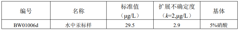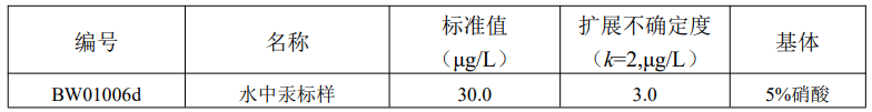 本标准物质用于水中汞的分析测试及宣贯的分析方法确认与评价、仪器校准等实验室质量控制。