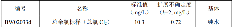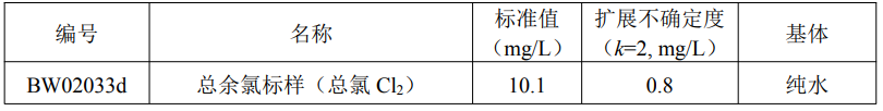 本标准样品用于总余氯的分析测试及宣贯的分析方法确认与评价、实验室质量控制。