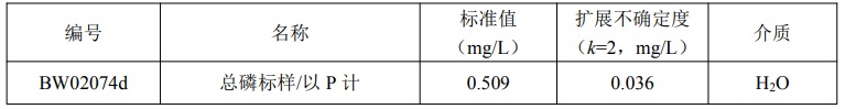 本标准品应按以下程序稀释后方可使用:用清洁干燥的移液管从安瓿瓶中准确移取 10.0mL 标样至 250mL 容量瓶中,用纯水稀释定容至刻度,混匀后立即使用。稀释后的标准值和扩展不确定度为: